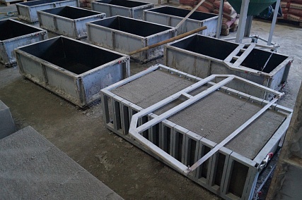 Шаблон выполнены и профильных труб, с пазом для шага распиловки 100 мм. Имеются эксцентриковые замки, места установки шаблона для резки находятся на основании формы.