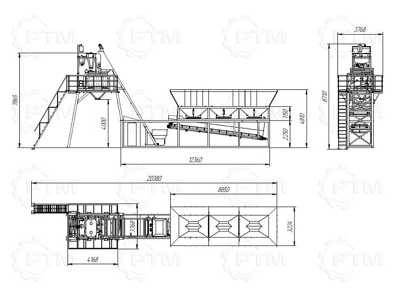 1. Дозирующий комплекс МБ-36 (3 секции по 12 м3): состоит из двух до четырех бункеров для хранения инертных материалов (щебень, песок, отсев). На каждом бункере имеется два пневмо- затвора, необходимых для точной дозации материалов. При дозировании материалы попадают на весовой ленточный конвейер, весовые датчики фирмы CAS Ю.Корея, при наборе нужного количества материалов, заслонки закрываются, подача прекращается. Объем каждого бункера от 2,5 м3 до 20 м3, в зависимости от комплектации завода. Каждый бункер оснащен вибродвигателем MVE 300/3.